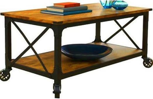 Amazon Com Rolling Coffee Table With Shelf Wooden Metal Pine