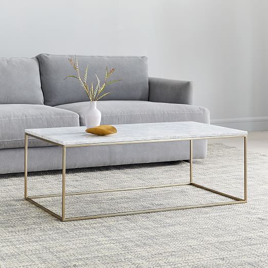 Westelm coffee table. Its walnut veneer finish is complemented by a marble slab top for additional shelving spaceperfect for stowing books during your next get together. It brings a floaty elegance to living rooms. Metal frame in an antique brass finish.