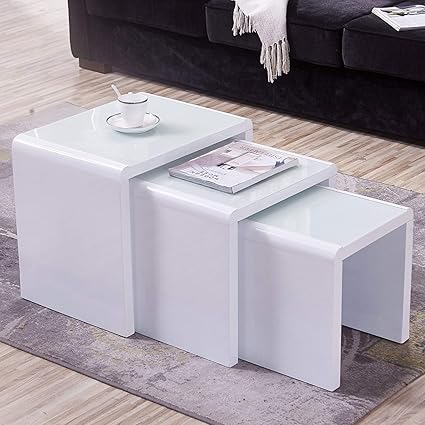 Mecor White Nest Of 3 Tables High Gloss Nesting Tables Wood Coffee