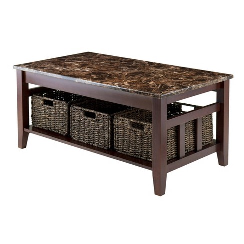 Zoey Coffee Table Faux Marble Top With Baskets Walnut Chocolate