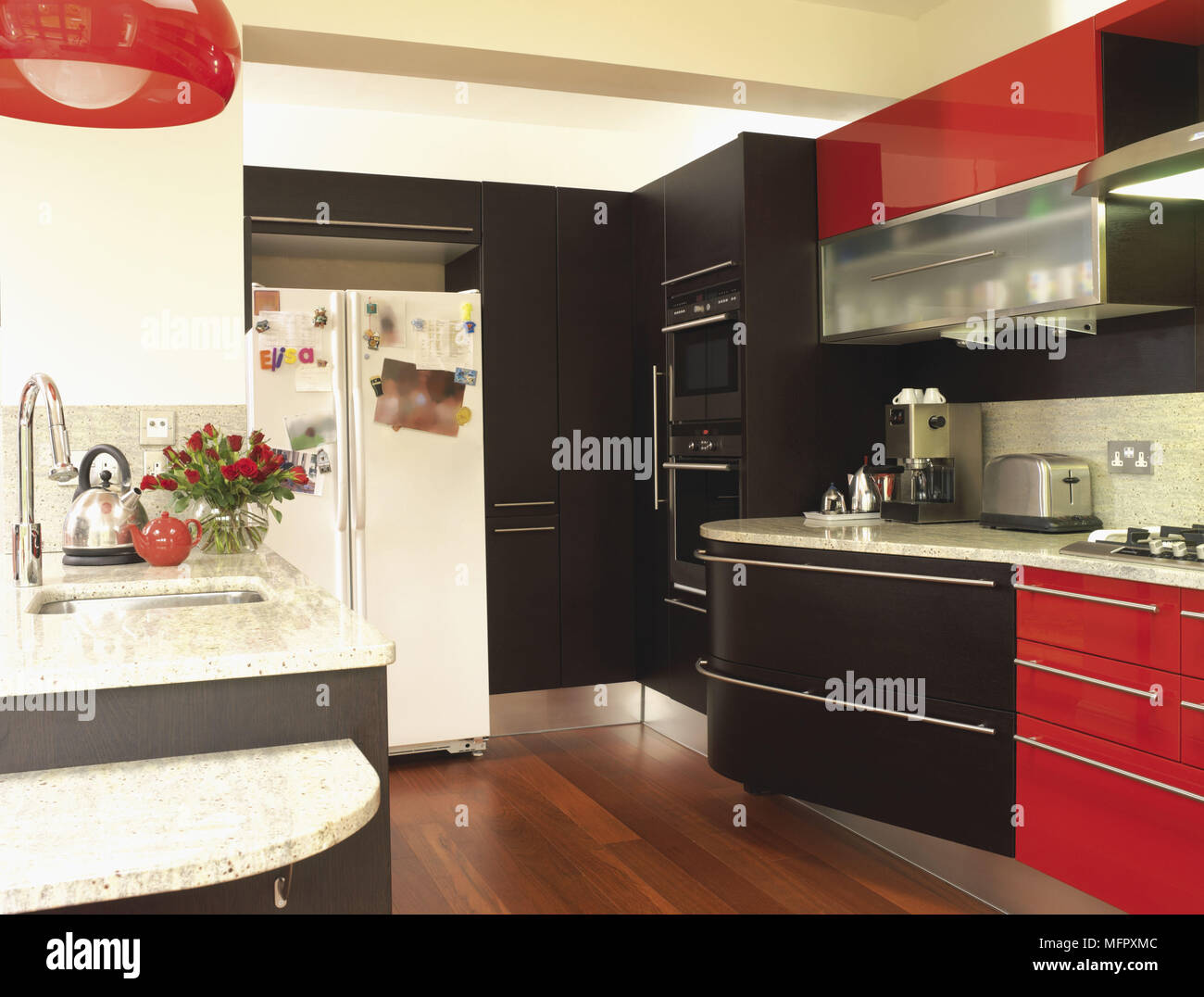 Contemporary Red And Black Kitchen With Fitted Units Stock Photo