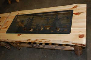 New Rustic Amish Made Log Coffee Table W Glass Top Wildlife Metal