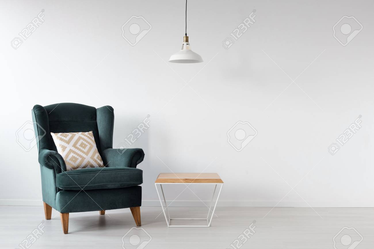 Moss Green Armchair Next To Wooden Coffee Table In White