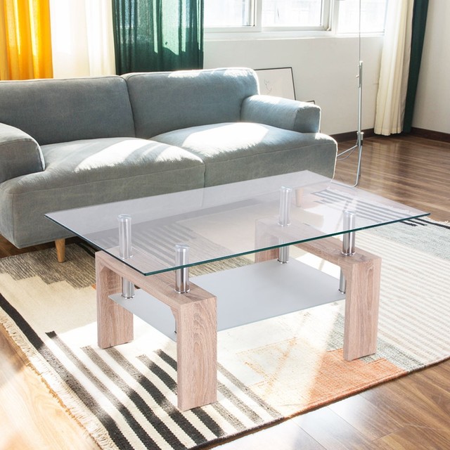 Living Room Wooden Glass Top Rectangular Coffee Table With Shelf