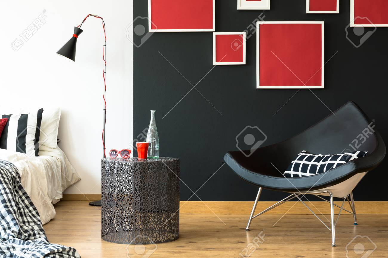 Black Swan Chair In Retro Bedroom With Red Sunglasses And Glass