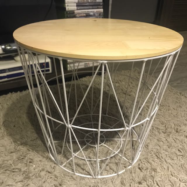 White Metal Wire Basket Wooden Top Side Table Storage Loft Living