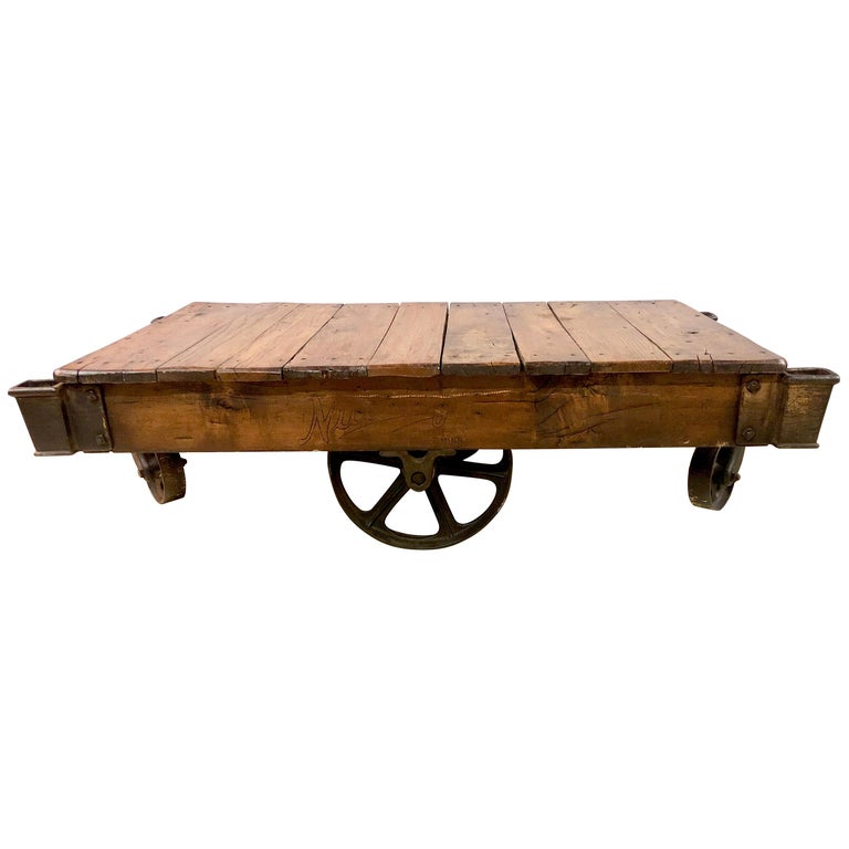 Vintage Coffee Table With Industrial Rustic Railroad Cart Wheeled