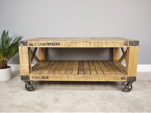 Industrial Style Reclaimed Wood Coffee Table Wheeled Truck Cart