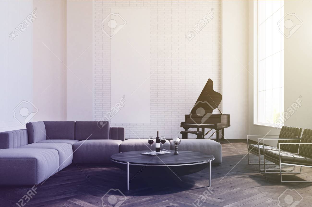 Interior Of Modern Living Room With White Brick Wall And Wooden