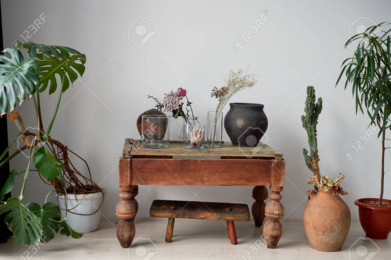 Old Wooden Coffee Table Cracked Plants In Pots And Tubs Glass