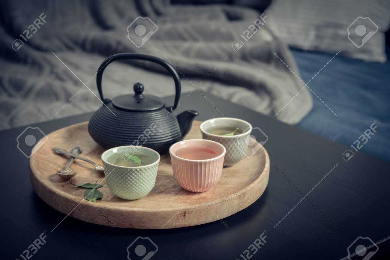 Black Iron Asian Tea Set On Wooden Tray On Coffee Table In Living