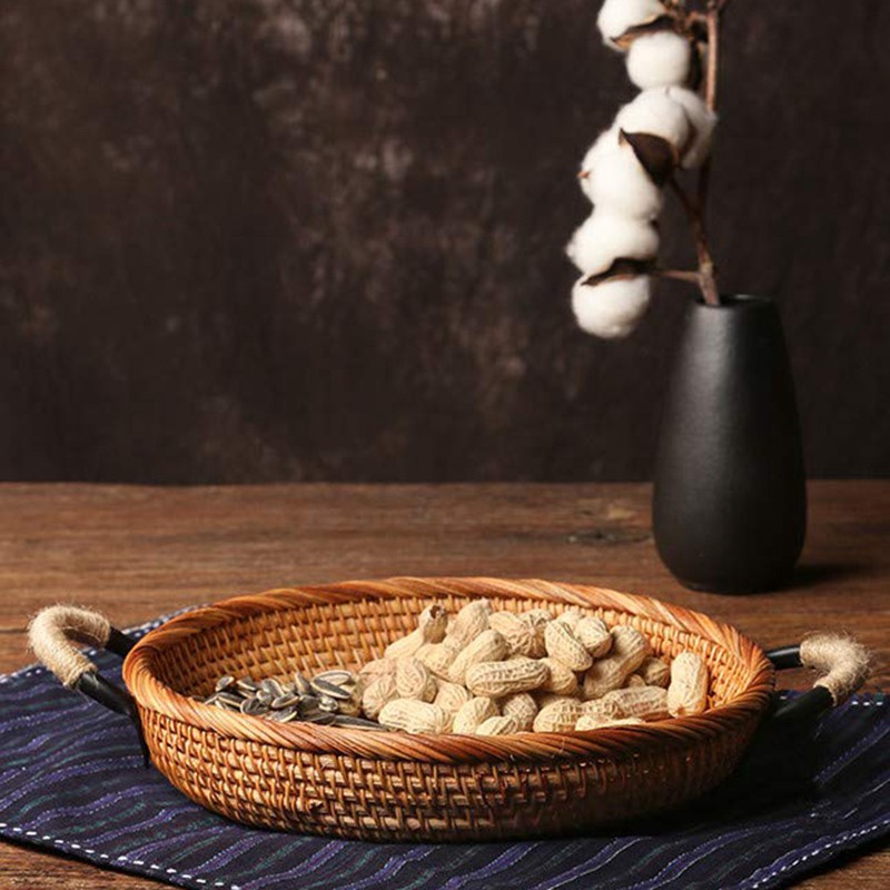 Rattan Bread Basket Round Woven Tea Tray With Handles For Serving