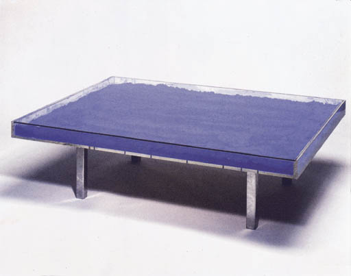 Available for sale from gagosian yves klein table bleue 1961 international klein blue ikb pigment glass acrylic wood and steel 14 18 49 14. Yves klein is probably best known for his signature shade of blue and for the paintings he created using naked models as paintbrushes but he also made a foray into the world of furniture design. French provocateur yves kleinhe of the paint slathered models rolled across canvasestried his hand at a new medium in 1961.