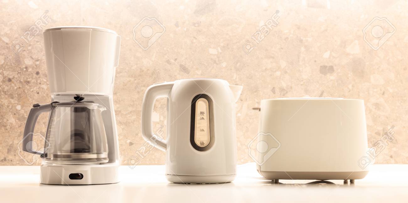 Modern Kitchen Appliances Placed On White Surface Colorful