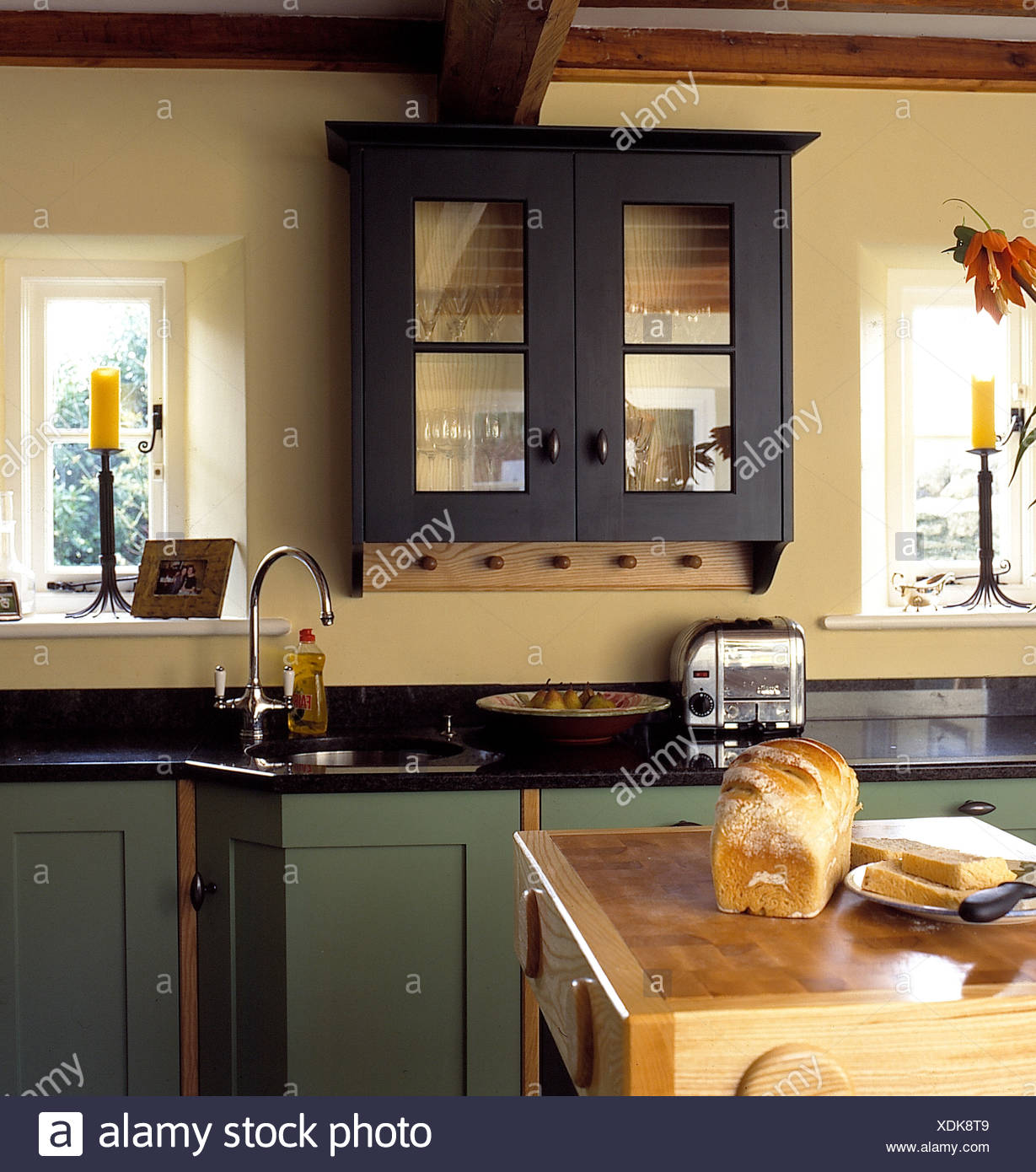 Glass Fronted Wall Cupboard Above Dualit Toaster On Black Granite