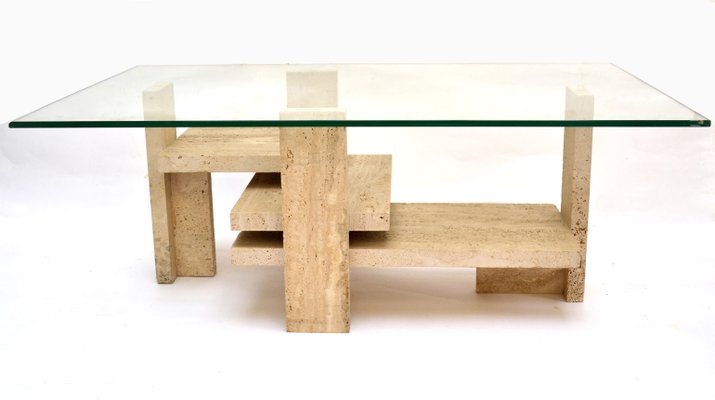 Sculptural Travertine Coffee Table With Rectangular Glass Top By