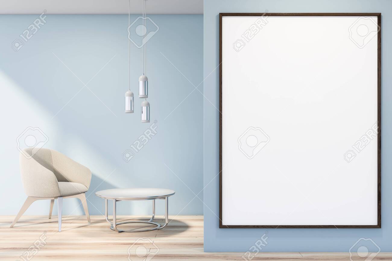 Interior Of Living Room With Blue Walls Wooden Floor White