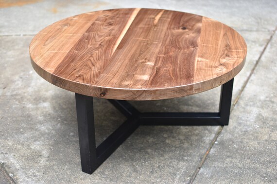 Round Walnut Wood And Metal Coffee Table Straight Tube Steel Legs