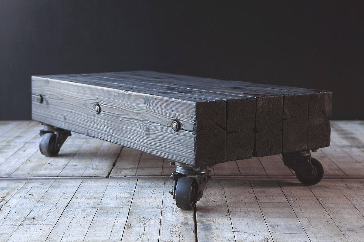 Reclaimed Rustic Coffee Table On Vintage Caster With Shou Sugi Ban