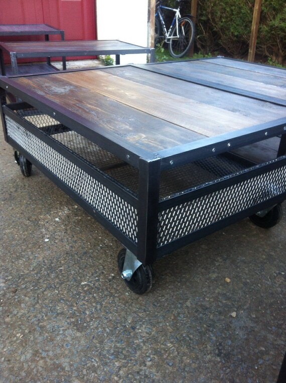 Wood And Steel Wheeled Coffee Table Etsy