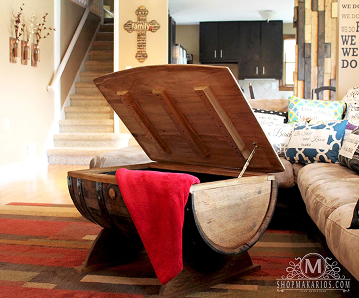 Crafted in indiana from half of a reclaimed whiskey barrel here is a barrel coffee table that is sturdy durable and beautiful. Store magazines games bottles blankets and more in the storage area below the hinged table top.