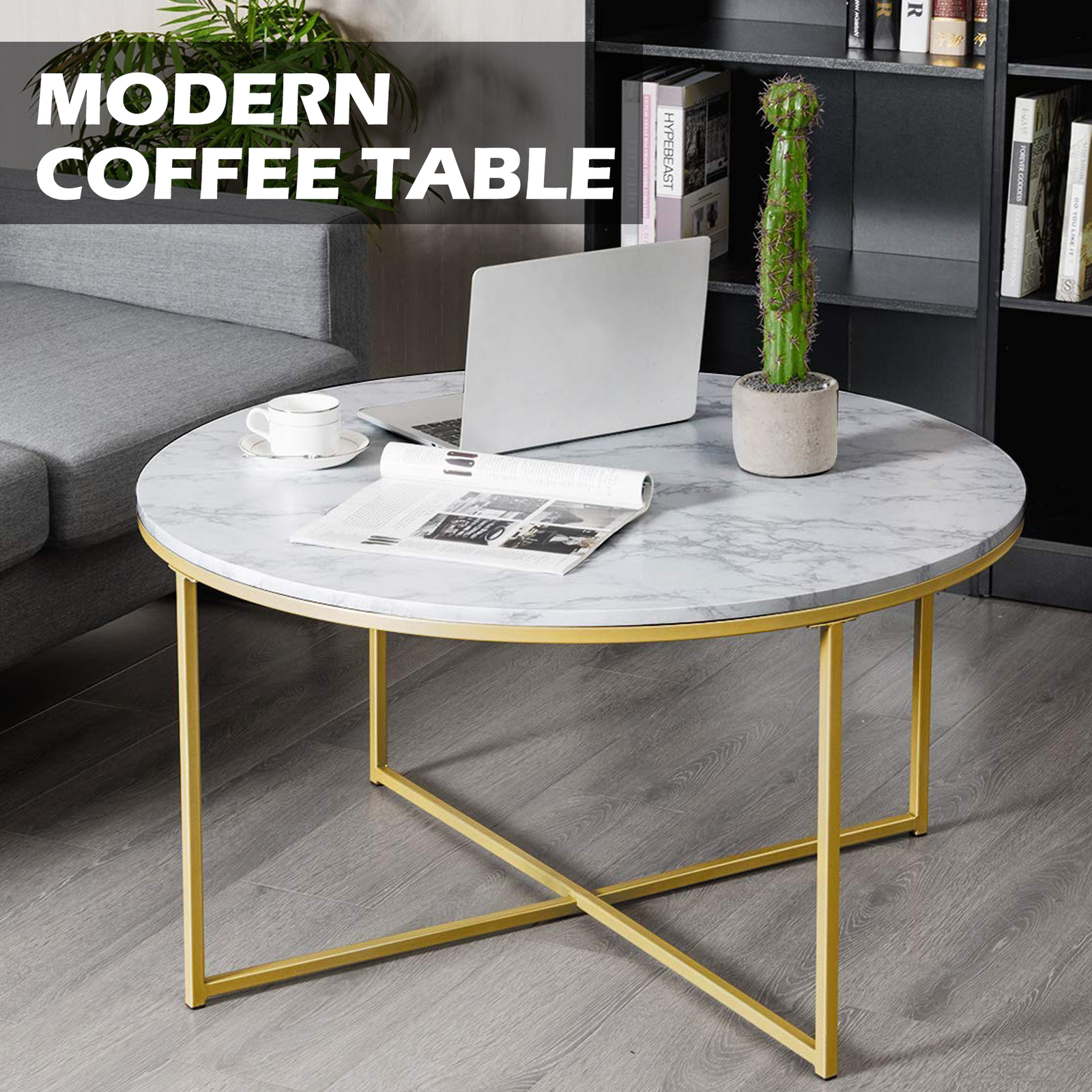 Modern Home Rolo Round Coffee Table White Marble Black Metal