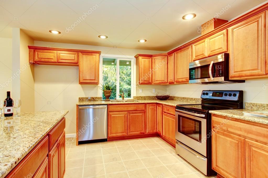 Bright Kitchen Room With Light Brown Cabinets And Steel Appliances