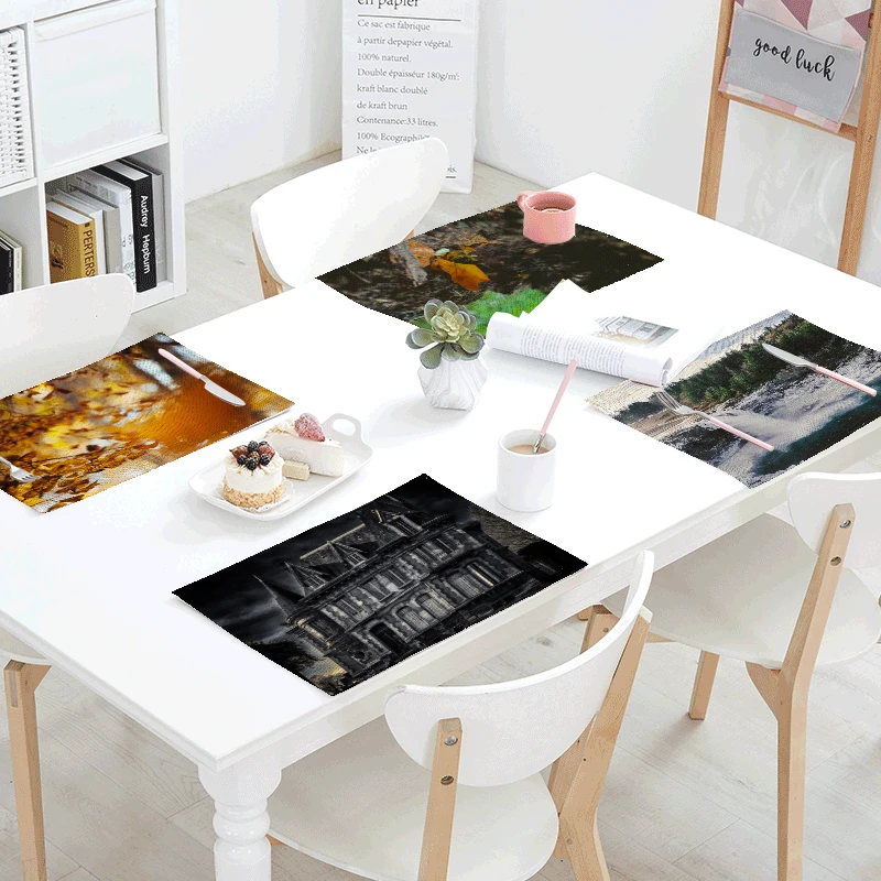 Retro 42x32cm Tablecloth Yellow Maple Leaf Forest House Cup Tea