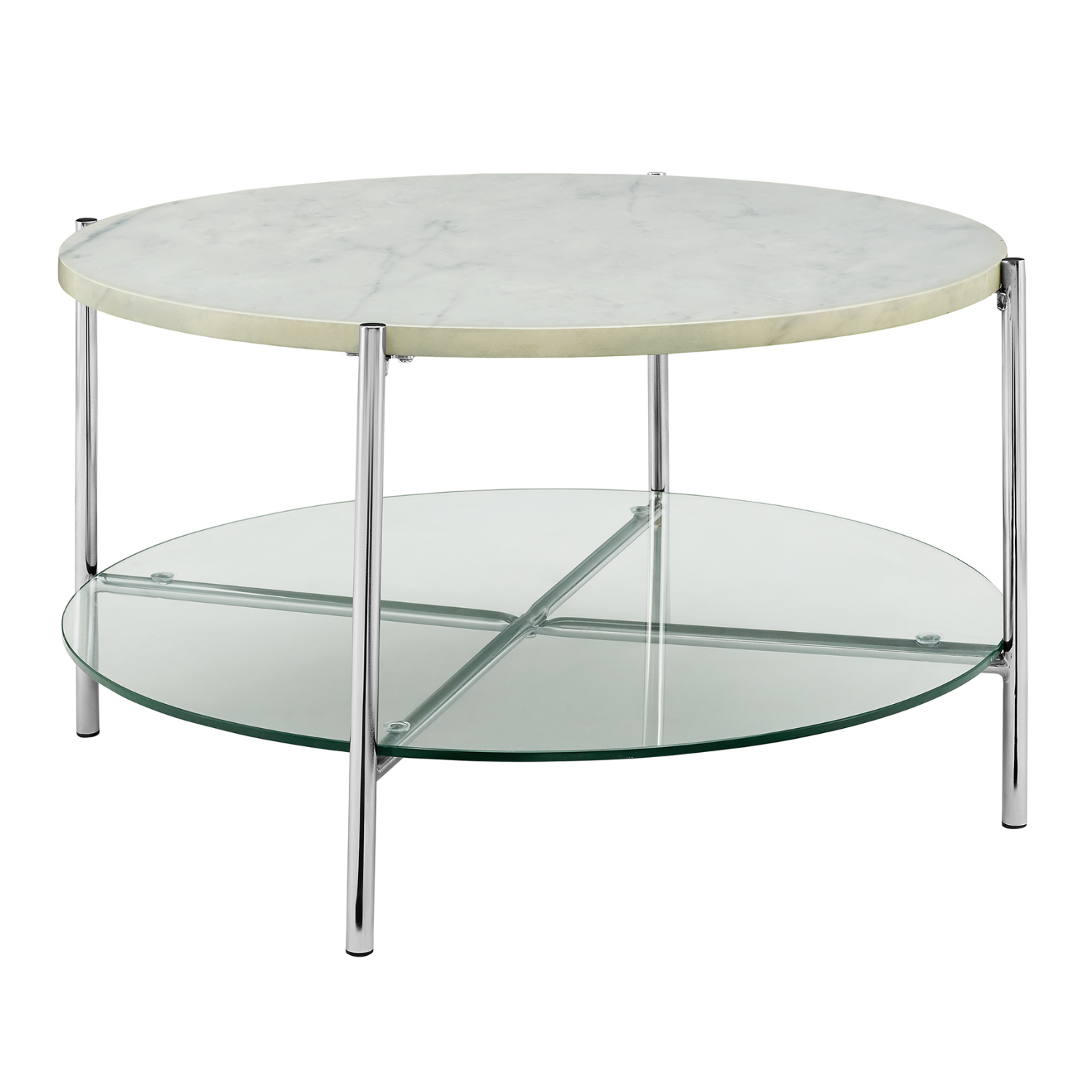 Round White Coffee Table In Faux Marble With Glass Shelf Foster