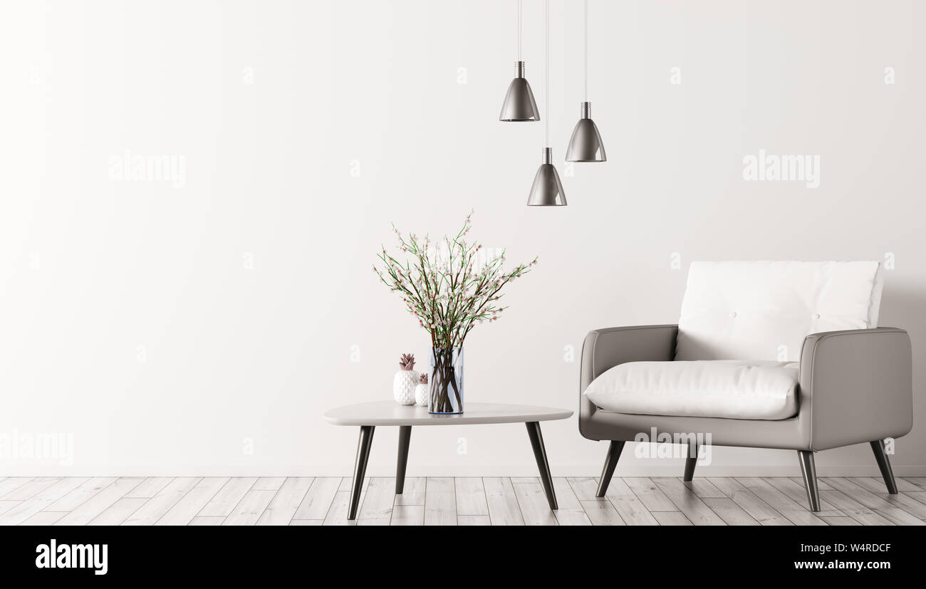 Indoor Plant On Steel Coffee Table And Armchair With Empty White