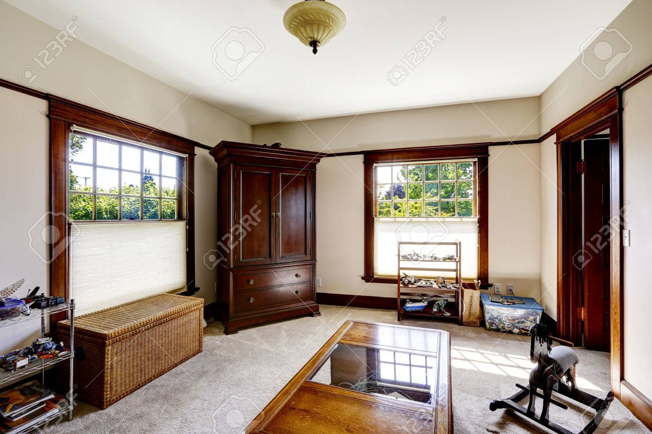 Room With Wooden Wardrobe And Wicker Chest Coffee Table With